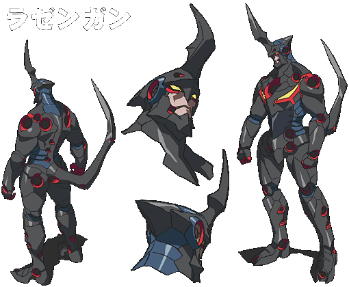 Its spiral theme is different than the Lagann\'s, as it is more jagged and square-like, compared to the smooth, more circular theme of the Lagann. Unlike the Gurren-Lagann\'s focus on using large, bulky Giga Drills, the Lazengann primarily uses long, thin drills that can change angles in mid-extension. Its spiral colour is red, unlike the green of the Lagann\'s, and its spiral gauge within the cockpit rotates counterclockwise when filling, rather than clockwise. The Lazengann is black, with a tail used for attack, and a horned helmet. It can transform its entire lower body into a gigantic drill (the Gurren-Lagann does the same, when docking with the Arc-Gurren). From an out of series perspective, its silhouette from the side bears a strong likeness to the EVA-01 unit from Neon Genesis Evangelion, another Gainax production. Notably, where Lazengann had one horn, Gurren Lagann had two.