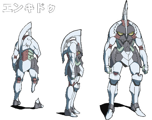 Année : 2007 Résumé : The Enki (エンキ, Enki) is Viral\'s personal Gunman, modeled after an armored samurai. The Enki is the product of significant innovation in Gunmen technology, and sports a number of advances that eclipse lesser models in performance, and is the first model seen to support solid-based ammunition. Unlike stout Gunmen, such as the Gurren, that have bulky limbs that can only be used in wide swings, the Enki is more segmented and has multiple joints that allow it to perform complex actions, such as throws, kicks, and various martial arts techniques. The Enki\'s arm and thigh plates conceal rows of hidden gun turrets that fire large steel projectiles (kunai). There are pop-up compartments in the shoulders that can fire a single volley of rockets, and the entire chest plate can open to reveal a number of launchers that deliver an explosive payload of missiles. The Enki possesses a wrist mounted concave blast-shield, and a helmet with a large black ring atop of it, that is actually the charging focus for a medium-range particle beam cannon. Its helmet becomes the possession of Simon and Kamina, as they stole it when they first combined to make the Gurren-Lagann.