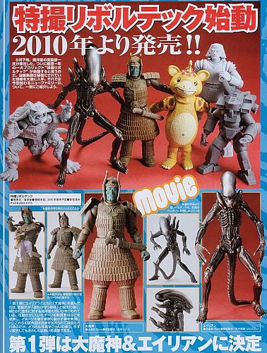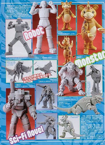 On connaissait déjà la plupart de ces modèles même si deux petits nouveaux font leur apparition, l'un dans la catégorie "Sci-Fi Novel", pour le second, je ne sais pas si c'est un robot ou s'il est tiré d'un livre. On voit donc que, à l'instar des Yamaguchi qui étaient séparés entre "humains", "super robot" et "real robot", cette nouvelle gamme sera également divisée en plusieurs catégories : films (Alien), robot (Giant Robo), monstres (Gamera) et Sci-Fi novel. Personnellement, ça me plaît bien, un bon gros souffle nouveau sur les Revoltech et avec une thématique qui permet d'avoir des figurines très diversifiées.